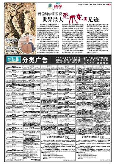 据新华社电 由中国地质大学(北京)、福建省英良石材自然历史博物馆领衔的科学家团队6日宣称,该团队此前在福建发现的龙翔恐龙足迹群中的大型恐爪龙类恐龙足迹,为目前已发现的世界最大恐爪龙类足迹,其中5
