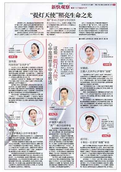 祝广东45.1万名护士节日快乐 新快报讯 护士,是在重症监护室里彻夜未眠的“提灯天使”,是面对生死边缘果断决断的技术能手,更是给予患者心灵慰藉细心倾听守候者。今年5月12日是第 113 个国际护士节,当天,广东省举行了分享会,倾听白衣天使的故事。 新快报记者获悉,近年来全省护士队伍持续壮大,注册护士总数从2012年的20万人增加到2023年的45.1万人。注册护士数量以平均8.1%的幅度逐年增加,每年约有2.2万的新生力量补充到护士队伍。 在每千人口中,注册护士配比数从1.81人增加到3.55人,医护比增加到1:1.25,护士队伍学历构成、职称构成持续优化,综合素质和专业服务能力持续提升。 此外,广东省通过深入开展改善护理服务行动,让护理工作“量”“质”齐升。目前,全省开展责任制整体护理病区占比98.73%,243家医疗机构开展“互联网+护理服务”试点,为居家患者提供3类43项医疗护理服务项目,895家医疗机构开展老年人居家医疗服务,越来越多老年人在家就能享受到专业的护理服务。 这些“提灯天使”心中是理想手中是绝活 广东45.1万名护理人员,是怎样如南丁格尔般提灯照亮生命之光,守护人们健康的?昨日,广东省卫健委举行了国际护士节分享会,国际“南丁格尔奖章”获得者、医科大学护理学专家、资深男护士、专科护士长、“最美护士”等5位优秀护士代表分享护士从业的不平凡故事。 故事1 温伟莲:网友称她“女侠护士” 2022年11月3日,惠州市第三人民医院的90后急诊科护士温伟莲下夜班正在家酣睡。忽然,窗外震天的撞击声将她从梦中惊醒,她甫一看到家门口突发了车祸。凭多年养成的职业敏感,温伟莲第一念头就是“救人”!她顾不得危险,穿着睡衣就跑到马路上,跨过路中间的护栏,抢先救人,主导救出出事车辆上的3名人员。 这段犹如“大侠现身”的一幕被路人录下了视频,见诸于各大媒体,受到广泛关注,得到了全国广大网友的点赞,称赞她是“女侠”和“最美护士”。 温伟莲分享说,医院强调护士要有良好的仪容仪表,但当时的一刻,她顾不得形象了,“后来看到被拍下来的画面,觉得自己蓬头垢面的样子挺不好意思的。”温伟莲还将被救者赠送的锦旗带到分享会。“这是我第一次收到的锦旗,看到它我特别惊喜,比听到夸奖和赞美都要开心。” 因为这次救人,温伟莲被评选上广东省2022年第三季“广东好人”、 “广东省见义勇为模范”、“广东好护士”等多项荣誉,她将公益组织奖励的1万元奖金捐给听障儿童医疗救助公益项目,呼吁更多人见义勇为、救死扶伤,把爱心和善举持续传递下去。 故事2 黄雪芳:为了护理病人自学中医理疗 在黄雪芳护士长所在的血液净化中心,长期透析给患者身上带去各种不适和痛处,顽固失眠、肾性腰疼,以及特别让患者瘙痒难耐的“穿孔性皮肤病”。 “我和团队很想帮患友们解决问题,尝试了许多西医的办法,收效甚微。于是我们想到中西医结合,翻阅文献找到了中医缓解透析并发问题的可能性。”黄雪芳说。护士工作极为忙碌,作为团队负责人,黄雪芳利用下班时间学习中医技术。她拜师学艺,找家人“试验”,发现效果不错,就加班加点为病人做刮痧、耳穴按摩等治疗。 来自高明的张叔被穿孔性皮肤病和透析煎熬得几近崩溃。黄雪芳买来刮痧板赠予张叔,耐心教会他和太太刮痧治疗。2022年疫情期间,黄雪芳用微信随访,指导张叔张婶坚持刮痧。2023年张叔再次回到佛山就医,他一见黄雪芳就撩开背后衣服,大家惊喜哗然:张叔全身皮炎消退,皮肤光滑。“护士的最大成就,就是看到护理技术在病人身上发挥作用,这能带来对职业的极大认同感,为了这种喜悦,我愿意付出更多努力。”黄雪芳说。 故事3 何斌斌:护理技术被认可 “男”丁格尔倍感幸福 急诊科是每个医疗机构最忙碌、工作强度最大的科室,人员流失率亦时有增长。身处广东实力排名数一数二急诊科室的何斌斌却坚定地“表白”:“此生无悔入急诊。” 在急诊岗位上,何斌斌不仅果断冷静,更注重提升技术。但男护士难免遇到来自女患者的尴尬。“比如一些婆婆,看到男护士来扎针,就下意识拒绝,认为我们粗手粗脚。”有一次,他被一位血管状态复杂的老婆婆拒绝后,多位女同事依旧无法“一针见血”。老婆婆无奈,只好同意何斌斌尝试。没想到,何斌斌细心感受婆婆皮下的血管,轻柔按压、寻找后,一针到位穿刺成功,婆婆惊讶地看着他:“你打的针,我居然感觉不到疼。”而后,婆婆看急诊都点名找“那位男护士”。 “我们男护士最大的鼓舞,就是患者认为我们安全可靠,这种感觉特别幸福。”何斌斌说,作为男护士,他对当前护理事业飞速发展现状十分鼓舞,“除了救死扶伤,我们还参加急救宣讲,将健康知识带给千家万户,十分有意义,我没理由换科室或转行。” 故事4 宋慧娟:注重人文关怀让护理有“温度” “每天倾听五分钟”“让我们一起来”“何时说再见”,这是资深护士长宋慧娟常对年轻护士灌输的三个人文关怀课题。“护理行业贯穿人类的生老病死,为此,作为护士一定要非常有爱心,除了技术必须娴熟,还要时刻关注患者的感受。”在宋主任主导的护理科,她带领同事精耕专业,苦练技术,提升素养。 “我们医院的护士有一个传统,每天不管多忙都要抽5分钟与患者家属交流,或拿出专门时间,到病人身边倾听他们的感受和需求。” 遇到一些创伤康复患者,