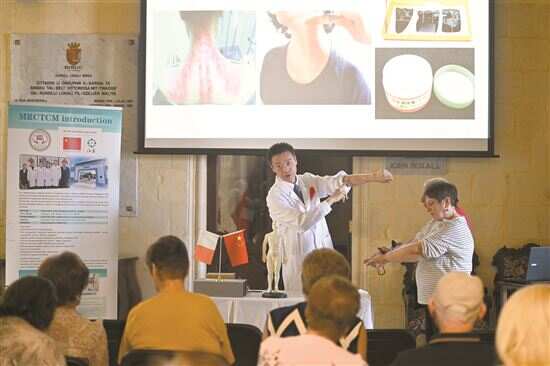 5月24日,在马耳他比尔古,中国援马耳他医疗队队员杨智杰(中)讲演中医知识。新华社发 |