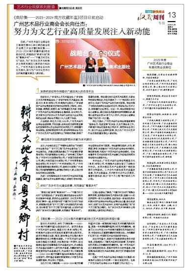 《南珍集——2023-2024南方收藏年鉴》项目日前启动 日前,广州艺术品行业商会在工美港艺博中心举行第四届会员大会第三次会议暨《南珍集——2023-2024南方收藏年鉴》项目启动仪式,同期启动“耕读大地”奔向“粤美乡村”——“千镇万村文化行”活动,为广东文化艺术与岭南乡土特质发展注入新的活力和动力。广州艺术品行业商会会长向仕杰表示,努力为广州文化艺术行业的高质量发展注入新动能。 1 发挥桥梁纽带作用提供广阔且深入的交流平台 活动当日,广东省关山月艺术基金会、广东省杨之光艺术教育基金会、广东省许钦松艺术基金会,雅昌文化(集团)有限公司、岭南美术出版社、广东省游戏产业协会等多家友好商协会的领导,许钦松、关怡、孙洪敏、郭莽园、洪楚平、杨飞武等著名艺术家、学者,广州艺术品行业商会荣誉会长鲁晓昆、会长向仕杰,党支部书记卢志安以及艺术品行业的各大企业和机构的企业家、商会会员等近100人出席了活动。 大会现场,向仕杰介绍,2023年,广州艺术品行业商会奋进拼搏,开拓创新,在商会党支部和理监事会的坚强领导以及全体成员的共同努力下,积极履行商会职能,发挥桥梁纽带作用,团结带领商会会员为广州文化艺术产业的发展作出了积极的贡献,取得了显著的成绩。商会通过举办各类艺术品展览、交易会和拍卖会等活动,为会员提供了一个广阔且深入的交流平台,促进了艺术品产业的交流与发展。商会加强了与相关机构和社会组织的合作,带动会员以艺术之名,积极履行社会责任。过去一年,商会积极参与社会公益事业,通过组织各类慈善拍卖和捐赠活动,募捐公益资金达到360多万元人民币,为社会公益事业贡献了自己的一份力量。 向仕杰表示,广州艺术品行业商会将继续秉持“服务会员、促进发展”的宗旨,扎实开展会务工作,不断提升商会的服务能力和水平,规范商会各项工作,助力行业企业顺利发展,努力为广州文化艺术行业的高质量发展注入新动能。 2 聘任鸥洋关怡郭莽园罗奇孙洪敏为学术顾问 当日,大会审议成立了“传播专业委员会”“环境艺术专业委员会”“‘百千万工程’艺术专业委员会”三个专业委员会。并通过投票选举通过了广州亚青投资管理有限公司为新增副会长单位;广东岭南工艺美术馆、广州百村文化发展有限公司、广东国艺拍卖有限公司、佛山市抱艺堂文化有限公司、广州市草草修长食品有限公司、宇世代(广州)科技有限公司、广州市全程图像数据处理有限公司、珈润文化发展(广东)有限公司为新增理事单位;新增会员单位11家,以助力商会会员单位全面发展。 为进一步加强商会在文化学术及专业知识的基础建设,提升会员专业素养与能力,积极引导学术型、专业型商会的学习氛围。商会新聘任鸥洋、关怡、郭莽园、罗奇、孙洪敏为广州艺术品行业商会学术顾问,聘任郭浩满、刘奕为广州艺术品行业商会顾问。任命有着多年艺术品拍卖与艺术金融工作经验的陈莉为商会秘书处副秘书长。 本次会议,广州艺术品行业商会和雅昌文化(集团)有限公司,岭南美术出版社签订了战略合作协议。共同为湾区艺术产业提供更广阔的发展平台和服务。三方合作内容包括艺术品鉴定备案,艺术出版基金,艺术数字化合作以及展览,重要年度活动,助力“百千万工程”等方面的工作计划。 3 讲好广东乡村文化建设故事,共同建设“粤美乡村” “耕读大地”奔向“粤美乡村”——“千镇万村文化行”也同期启动,广东省老区建设促进会会长陈开枝在致辞中希望,更多的企业家朋友、文化艺术界的朋友们携手一道,共同参与到“千镇万村文化行”活动中,积极展示投身“百千万工程”火热实践的风采与担当,充分彰显“百千万工程”的丰富内涵,以实际行动讲好广东乡村文化建设故事,共同建设“粤美乡村”。 记者从组委会了解到,“千镇万村文化行”将集合跨界资源,发挥高校智库艺术团体优势,组建100+的名师团和一批文化志愿者,组织发动一批有志投身乡村振兴的行业商会协会和企业等社会力量,联合走进乡村,实现“文化艺术进乡村、农特产品进湾区”的“百千万工程”助力模式。为广东文化艺术与岭南乡土特质发展注入新的活力和动力。 4 《南珍集——2023-2024南方收藏年鉴》探讨艺术品背后的深层价值 签约仪式结束后,举行了《南珍集——2023-2024南方收藏年鉴》出版启动仪式。该项目是由广州艺术品行业商会、雅昌文化(集团)有限公司、岭南美术出版社共同发起的重要年度出版项目。该项目将通过出版、展览、媒体等全方位展示南方藏家群体的实力和整体面貌。广州艺术品行业商会联合雅昌文化集团,对征集的每一件原作,经过编委会鉴定后签署雅昌艺术品鉴定证书,并由雅昌艺术品鉴证备案中心进行技术备案,为藏家制作高精密度防伪作品备案证书,作品图片录入《南珍集——2023-2024南方收藏年鉴》由岭南美术出版社出版发行,同时鉴证备案的数据将存入中国艺术品备案数据库,向全球公开查询。 主办方介绍,《南珍集——2023-2024南方收藏年鉴》不仅是一部展现南方地区艺术收藏风貌的年鉴,更是一本充满智慧和鉴赏力的艺术收藏指南。涵盖了从2023年至2024年间南方重要的艺术品成交记录、市场动态以及重要收藏家的深度访谈。为收藏家们记录下这一时期的艺术品市场走势与变化。 在
