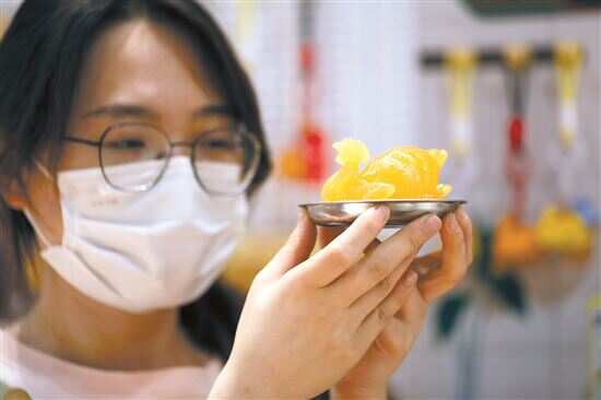 ■5月23日,粤博的工作人员在展示玉雕鸡摆件以及配套的不锈钢碟子。该文创主体由树脂制作。 新快报记者 郗慧晶/摄 |