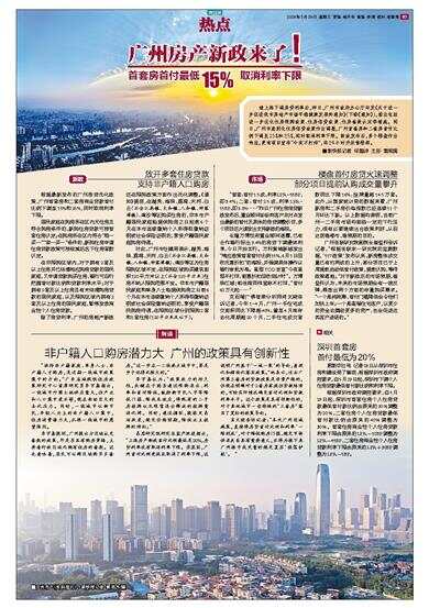 首套房首付最低15% 取消利率下限 继上海下调房贷利率后,昨日,广州市政府办公厅印发《关于进一步促进我市房地产市场平稳健康发展的通知》(下称《通知》),推出包括进一步优化住房限购政策、住房