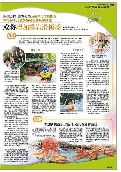 醉观公园、晓港公园游乐场今年将歇业 市内多个儿童游乐场面临升级改造 近年来,文化公园、麓湖公园的儿童游乐园相继歇业。越秀公园、流花湖公园等陆续对园内的游乐设施进行了升级改造。广州市林