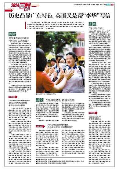 “又是帮李华写信”“希望他快点考上大学啦”……昨日,物理、历史、外语三个科目开考。广东考生在下午的英语考试中,又遇见了“老朋友”李华,有考生幽默祝福李华“快点考上大学”,有人则表示遇见李华“很安心”。此外,物理科目今年题型新颖实验题多,不少考生表示有难度。历史科目则相对常规,凸显了广东地域特色。 物理 题型新颖实验题多 “时间有点不够用” 物理考试结束后,广州市第十六中学考点的一名考生刚走出考场,就大声跟同伴感慨:“物理比数学还难。”在该考点,不少考生反映,今年物理科目的题目很长,阅读量大。李同学说:“整场考试写下来,感觉压力挺大的,时间有点不够用。”陈同学也表示:“感觉今年的物理题比往年的难一点。”他印象比较深刻的是一道选择题,“题目给出了两个半径,但答案是基于其中一个半径来计算的,得仔细甄别。” 在广州奥林匹克中学考点,也有不少同学对物理感到有点“意外”,“以往实验只考一两个,今年一口气考了好几个实验题。”谢同学告诉记者,今年题型比较新颖,有些平时很少遇到的,“比如有一道是分析冲量的,还有一道是关于压强导致气体交换的。”同个考点的黄同学则对其中一道汽车安全气囊的题比较有印象,“汽车保护装置这一道算是跟生活联系比较紧密的。” 华南师范大学附属中学考点的骆同学表示,今年的物理考试题型不算很偏,但相比广州一模二模稍难一些。“感觉该拿的分是拿到了,考得一般。” 考题解析 广州市第六中学物理高级教师王丽珍: 增强应用性和创新性 考查学科核心素养 王丽珍点评说,今年广东物理试题依托高考评价体系,通过创设典型的生活实践和学习探究情境,全面考查学生的物理学科核心素养。“试题在深化基础性的同时,增强应用性和创新性,有效地发挥了试卷立德树人、服务选才、引导教学的核心功能。” 她指出,试题把科教兴国的素材融入其中,比如说第二题,以我国正在建设的大科学装置为背景,引导学生了解我国的科技前沿。第九题引导学生关注近年来我国航天航空事业的发展,增强科技兴国的民族自信和远大理想。 试题以问题情境为载体,加强信息获取和分析能力的考查。比如第十四题,通过文字图形和图像呈现信息,要求学生通过提取整合有效信息来分析解决实际问题。同时突出推理论证能力和科学探究能力的考查。第十五题考查了带电粒子在组合场中的运动,对分析推理和论证能力的要求较高。 此外,优化情境设计,落实课标理念。命题关注日常生产生活实际和科技前沿,需要将生产生活实际应用进行抽象建模,迁移知识,解决实际问题。比如说第四题、第八题、第十三题、第十四题,坚持从真实问题情境建构物理模型,还原知识应用和实践过程,增强了试题的综合性和应用性。 历史 凸显地域特色 内容有创新 “没有很难的题,都做完了,题量跟平常差不多。”历史科目考试结束后,广州市第十六中学考点的林同学接受记者采访时说,今年的历史题“比较常规”,其中一道关于“广东和中国近代史”的小论文题令她印象深刻,最后她选取了三元里人民抗英、黄花岗起义、虎门销烟等历史事件进行论述。 华南师范大学附属中学考点的熊同学则表示,今年历史的选择题比较难,“是做过最难的一套”。她印象比较深的是材料题,“我写得比较慢,虽然完成了考卷,但感到时间上比较仓促,考完心情有一些低落。” 广州奥林匹克中学考点的林同学印象比较深的也是跟广东相关的题目,“考到广东的历史,突出了地域特色。”她表示,这是一道12分的大题,平时比较少遇见,算是一种创新。 考题解析 广东仲元中学历史正高级教师戴世锋: 总体保持平稳 知识覆盖面广 戴世锋表示,2024年广东高考历史试题,在遵循中国高考评价体系以及普通高中历史课程标准的基础上,挖掘历史学科在育人方面的独特价值,重点考查核心价值、学科素养、关键能力、必备知识,避免了偏题、难题、坏题和生题。试题总体上保持平稳,考点和能力层次分布合理,知识覆盖面广,突出了对关键能力的考查。 他认为,今年的广东高考历史试题紧跟时代步伐,聚焦能让学生表现出正确的世界观、人生观、价值观和历史观的历史问题情境。比如非选择题第二十题,以二战后远东国际格局下的中华人民共和国外交为主线,意在考查学生用唯物史观分析问题,让学生理解历史现象,引导学生不能简单机械地学习历史。 另外,考题凸显广东特色,厚植家国情怀。非选择题第十九题是开放式试题,依托广东在近代中国民族民主革命以及近代化历程上的突出作用,围绕广东与近代中国治理问题,达到在考试评价中落地培养家国情怀素养的目标。同时,今年历史试题既明确指向学生学习历史的价值认识,同时又指向学生思考问题的角度价值衡量的标准,以及情感文化的认同,彰显了历史新课程理念。 英语 “李华年年有,祝他早日考上大学” 近几年高考的英语试题中,李华频频上线。8日下午的英语考试,考生又在作文试题中遇见“老朋友”李华。今年的题目是李华在公园上了一节美术课,要给外国笔友写一封信,介绍自己完成的作品及上美术课的感受。 广州大学附属中学考点外,提前交卷的一名考生兴奋表示,“今天的作文考题还是帮李华向外国笔友写信,需要向他介绍在公园画画的活动,并介绍画的内