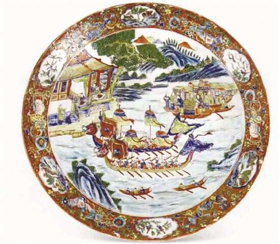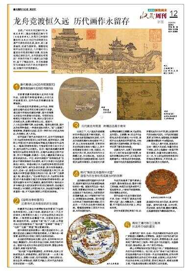 目前,广州市天河区端午节(车陂龙舟景)、清远市清城区端午节(白庙疍家游龙)、东莞万江申报的赛龙舟(龙舟月)均已为非物质文化遗产代表性项目名录,其中,前二者是省级,后者为国家级。随着短视频平台的日益发达,几乎随时可以看到龙舟竞渡的精彩场景,但没有视频记录的古代,龙舟到底如何竞技?所幸历代有不少画家以此为题材,留下了精品名作。本文梳理唐宋元明清各代的不同龙舟题材作品,回望历代的竞渡盛况。 1 唐代青绿山水《龙舟竞渡图页》 最早表现端午龙舟的书画作品 目前看到最早表现端午龙舟的书画作品,当数唐代李昭道青绿山水的《龙舟竞渡图页》,这件作品目前藏在故宫博物院。 作为典型的早期青绿山水作品,李昭道的这幅作品运用的石青石绿历久弥新。通过画中所描绘的建筑判断,画中的情景当为宫廷中欢度端午的场面。华丽的宫廷楼阁位于画面的右下角,湖水以留白的方式体现出来,远景为青绿的山峦。画面中,人小如豆却清晰可辨,生动有趣。值得注意的是,画中龙舟有两种造型,一种是体型较为硕大,“船”上搭建了楼阁亭榭,更像观光龙船,而另一种则与今天的龙舟相近,舟身瘦长、多人齐划。 似乎延续了唐代龙舟竞技方式,在宋代张择端的(传)《金明池争标图页》上有所体现,据资料显示,《清明上河图》的作者张择端有两幅龙舟题材的作品传世,一幅是《西湖争标图》,可惜该图目前只有文字记录,画作在明代以后散失。而另一幅则是现藏天津博物馆的《金明池争标图页》,这幅作品曾经过明代安国、项元汴等鉴藏,而最后一位私人藏家是天津实业家张叔诚先生。不过,有研究称画中“张择端呈进”名款由于跟张择端的书法迥异,有不少学者认为这款或是他人添加。学者余辉认为,《金明池争标图》页在明代流落江南时,被作伪者后添款,欺为张择端真迹。此外,还有一说,是图为北宋风俗画家高元亨之作,依据是北宋郭若虚《图画见闻志》介绍,高元亨“工画佛道人物,兼长屋木。”但余辉考证认为,《金明池争标图》页不是张著跋文提及的张择端《西湖争标图》,该图所绘殿宇系宋代江南建筑,建筑布局和人物活动大多与南宋孟元老《东京梦华录》的记载相同,但在幅式和构图上与《清明上河图》卷无关,其绘画风格属于华贵富丽一路,不可能是《清明上河图》的姊妹卷。 2 《金明池争标图页》 还原宋代龙舟竞技的欢乐场面 收藏周刊记者在天津博物馆官网看到了《金明池争标图页》,上面介绍称,画家在不足一尺见方的绢本上将周围约九里三十步的金明池及岸边的景物、人物悉数生动摹画下来,且画面呈现出开阔、疏朗的布局。由画面下部“池门”入园,以界画手法分别细致描绘了“临水殿”“宝津楼”“棂星门”“仙桥”“五殿”“奥屋”等主要建筑物。 画中表现的竞标场景以一艘大型龙船为中心,这艘大型龙船上建有约两层高的楼阁,人们集中在一楼观看,船的两边分别有三根巨大船桨在划动。 在龙船的两侧各有五艘小龙舟,龙舟形制与今天相近,舞旗招引,舟中桨手则奋力划棹,向前方标杆冲去。画面中各龙舟左突右进的空间安排,营造出争标的激烈、刺激与紧张气氛。 “临水殿”中皇帝赐宴群臣,共赏争标;池岸上百姓或观龙舟,或春游赏玩,或买卖交易……众多人物汇聚图上,虽微小如蚁,但仔细观察,人物比例恰当,姿态各异,神情生动,颇具艺术魅力,把宋代龙舟竞技的欢乐场面一一还原。 3 元代画龙舟竞渡 热情远远高于南宋 比较之下,元人画龙舟竞渡题材的热情远远高于南宋画家。已故美术史家高居翰研究发现,元代龙舟竞渡类题材长卷绘画有7件之多,加上其他信息来源,目前所知的此类绘画长卷有10幅以上,其中有图像面世者共10卷,但画名、内容均大同小异,其共同点均作为王振鹏之迹,为白描长卷。包括《龙池竞渡图》《宝津竞渡图》卷、《龙舟图》《金明夺锦图》,还有纽约大都会博物馆藏的王振鹏(款)《金明池龙舟图》。王振鹏(款)的这件《金明池龙舟图》的建筑十分华丽,表现手法也是典型的界画风格,木构建筑硕大而装饰精致,所用妙笔几乎还原了建筑具体构造。 在建筑内外,站满了密密麻麻的人们,他们有些在屋内畅聊,有些则依靠在岸边护栏,正兴高采烈地看着河上十数条龙舟争相竞渡。 画面中的龙舟造型显然跟现在所看的龙舟大为不同,跟上述唐宋两代的也有较大区别。元代龙舟的造型更具“龙”的特点,首尾弯曲,舟身画满龙鳞,整体看起来十分威猛生动。 尤其让人意外的是,画面的右边有一艘巨大的龙船,体量仿若当下邮轮,龙舟上能建有一栋高于两层的建筑,体量与岸边建筑相当,这一点,与上述《金明池争标图页》所描绘场景类似,不同的是,这一幅的龙船更为壮观威武。 4 明代“剔彩龙舟图荷叶式盘” 造型为仿生变化而成是当时的创新 龙舟题材在明代画家中并不多见,画家郑重的《龙舟竞渡图》轴是珍贵的一幅。画面采用马远一角式构图,观看赛龙舟的老少人等集中在画面右下角的岸边,为获取更好的观赛角度,有人不惜骑于树干枝头,使得画面生动有趣。画中的留白则形成了烟波浩渺的湖面,四只龙舟、一只凤舟正在湖中挥桨竞渡。整幅画面精致工丽而不失活泼,为风俗画的佳作。 作品风格继承了唐代青绿山水画风,整体瑞丽生动,敷彩勾勒工丽细致,构图及运笔具有明代工笔绘画特点,人物细节刻画精