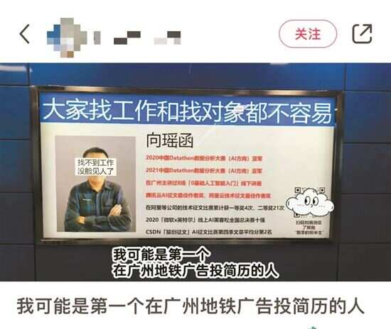 ■有网友花了约1000元在珠江新城站投了5天个人广告,广告内容是他的简历。 |