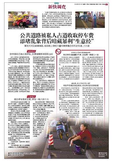 事发天河区棠德南路,每到晚上便有大量车辆停靠在非机动车道、人行道 “本就不宽敞的道路,的士还排成长龙停在路边,太堵了。”近日,有市民向新快报反映,天河区棠德南路一带存在的士乱停现象,严重影响市民生活、出行。记者走访发现,夜间8时左右,便有大量的士停在路边,还有个别网约车、私家车也是如此,造成交通堵塞。而这种违停的乱象却成为一些人的“生意经”。原来,每天晚上7时许就有人将交通锥放置在道路两侧占道,专门给的士等车辆提供停车服务,部分收费者还会提供洗车服务。 [市民投诉] 狭窄路段还被占道停车,交通堵塞影响居民出行 近日,市民林小姐向新快报反映,天河区棠德南路一带每天晚上有大量车辆随意停靠在非机动车道、人行道,导致交通堵塞,严重影响市民生活和出行。 6月5日晚上,新快报记者来到投诉路段走访发现,棠德南路为双向车三道,其中自东往西方向为单车道,相反方向为双车道,两侧各设一条非机动车道,车道未设置停车位。晚上8时,根据导航软件预测,棠德南路有950米的拥堵路段,预计驾车通行时间为7分钟。记者观察到,此时道路两侧的非机动车道、人行道停放了多辆轿车,其中大多为的士,且车内无人。少量有空位的非机动车道已放置交通锥,不时有人移开交通锥,随后就有车辆往非机动车道停车。一些车辆停靠后,近乎一半的车身超出非机动车道,占用机动车道、人行道的空间,这导致一些非机动车只能在机动车道行驶,原本应该停在人行道的单车和电动车只能被迫让道。此外,这些违停车辆停靠或离开非机动车道时,均会使道路更加拥堵。 “平常车辆乱停乱放的情况蛮多的。”刚搬来不久的刘女士已经注意到了这一现象。在附近住了一年多的海女士表示,自己的生活深受堵车影响,“晚上6至8时会很堵,我一般会提前一站下公交车,因为不想堵在车上,可能走路都比坐车快一点,”海女士补充道,“堵车也造成交通状况十分糟糕,有时候过马路都很担心。” 不过,也有市民对这一现象持不同看法。李女士十分体谅的士司机的辛劳,在她看来,道路拥堵的“锅”不仅在于车辆乱停,“每每有车辆掉头都会出现堵塞,所以问题不仅出在车辆乱停乱放,我觉得更多是因为道路原本就比较窄,才容易出现拥堵。” [记者暗访] 路边停车竟成生意,停车一晚八到十元 为何非机动车道会有交通锥?是谁占用了道路?又是谁挪开交通锥给的士、私家车违规停车?新快报记者暗访发现,交通锥的背后其实暗藏乾坤,公共道路成为私人牟利的“生意经”。 多位的士司机向记者透露,这些交通锥是有人刻意摆放,以此占用非机动车道及人行道,司机将车辆停靠在此需向其支付每晚8元的停车费,停车时间为每晚7时许至次日早上8时,部分会提供洗车服务。 循着线索,记者再次来到棠德南路。6月7日晚上7时许,记者看到,一位中年男子正搬着交通锥沿路摆放。晚上8时左右,便有背着腰包的阿姨挪开非机动车道的交通锥,引导的士往非机动车道停靠,并掏出手机向司机收费。有些阿姨甚至会帮忙将车辆停靠得紧凑一些,以便容纳更多车辆。 这些阿姨为何可以在公共道路收取停车费?记者以停车为由,和收取停车费的阿姨搭上了话。 “还有车位吗?私家车停一晚多少钱?”记者问。 “有,私家车停一晚10元,如果要洗车需再加10元。”收费的阿姨回答道。 路边如何洗车呢?阿姨告诉记者,她会从村里拉出水管洗车,保证干净。临走之前,阿姨还“温馨”提醒记者,必须在第二天早上7时30分左右将车辆开走,以免被交警抄牌。 记者发现,在相距不到50米处,有另一位阿姨在路边“看场”。不一样的是,该阿姨收取10元,却包含停车和洗车服务。记者提出是否可以选择其他位置停放,阿姨表示,需找其他人停车。她解释道,他们每人管理棠德南路一小截路段,对路段内的停泊车辆收费。不过,她也表示,这种行为都是私人收费。 [焦点] 为何的士司机们愿意被收钱? 附近停车场数量并不多,且收费一晚要几十块 对司机而言,花钱在公共道路停车相当于被“薅羊毛”,同时还冒着被抄牌的风险,这是何苦?新快报记者从多名的士司机口中了解到其中缘由。 一来,棠东村里住有大量的士司机,有较大的停车需求。据棠下街道统计,辖区内出租车和网约车的总数约为2700辆,如果再算上常住人口的私家车,车辆总数可能翻倍。然而记者观察到,棠德南路作为出入棠东村的主要道路之一,附近的停车场数量却不多,车位数量和空余车位都相对较少。二来,路边停车的费用相对于停车场会更低,这是性价比较高的选择。以棠德南路沿路的祥盛广场停车场为例,停车每小时收费10元,且上不封顶。潮盛大厦停车场15分钟收费4元,白天(8时至22时)封顶128元,晚上(22时至次日8时)封顶50元。有的士司机表示,“停车场要按小时收费,一晚上几十块钱,划不来。”此外,还有的士司机表示,自己每天早出晚归,从早上5时工作至晚上11时,回来时错开了交警的工作时间,因此车辆停在路边并不会被罚款。 被收钱,的士司机们怎么看? 明知不合理还是会妥协,但也有司机拒绝给钱 来自河南的的士司机阿辉(佚名)一家住在棠东村里,“下午4时我就出来开车,每天凌晨4时前要和另一位司机交接班。”谈到棠德南路的堵车问题,阿辉深有体会,“每天晚上都堵,凌晨3时之后更堵,因为的士都停路边。” 对于有人占道收取停车费的行为,阿