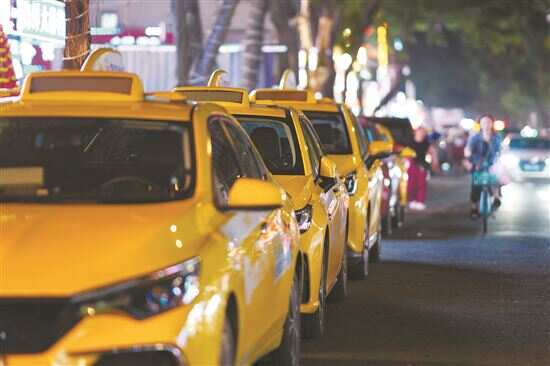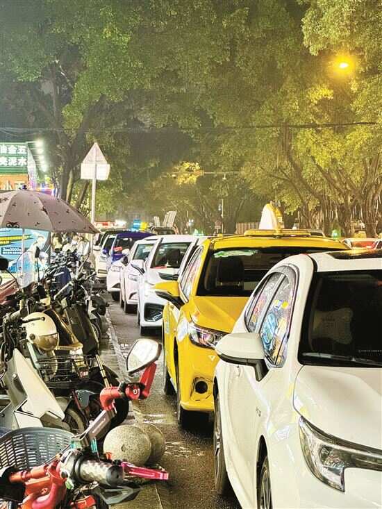 ■晚上,棠德南路两侧的非机动车道上,违停的的士排成长龙。 |