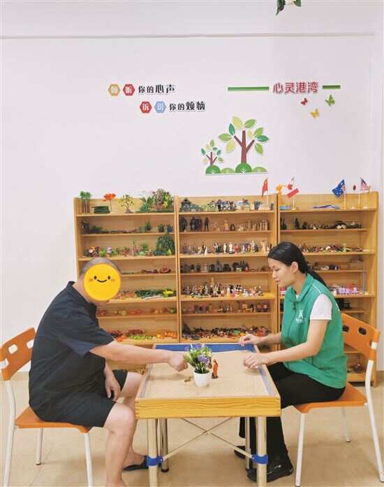 ■受助人员在社工帮助下使用心理沙盘。 |