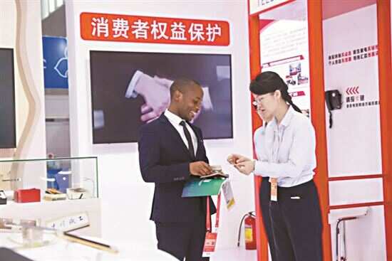 ■中国银行员工在往届中行展位热情为现场外国客户解答问题。 |