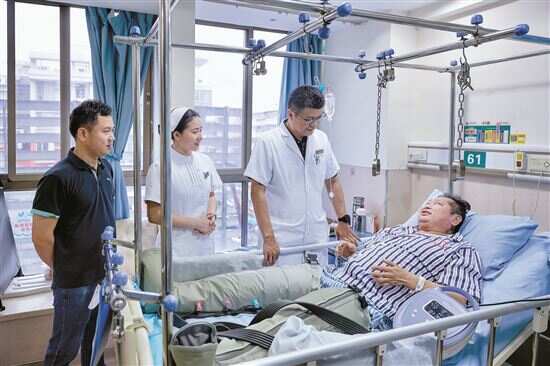 ■广州和平骨科医院关节骨科副主任医师刘春新(右二)查看沈明辉的康复情况。 |