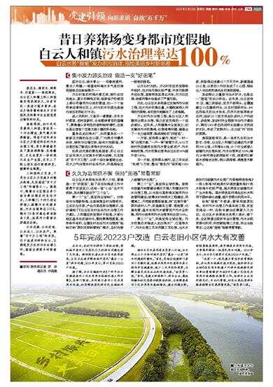 白云水务“握笔”发力农污治理,描绘美丽乡村新画卷 拔花生、摘西瓜、骑轮车、叹茗茶……每到周末,白云区人和镇上的人和园就变得热闹非凡,许多市民一家老小驱车前来,在这片饱含着岭南水乡与田园风光的都市农业园里度过愉快的时光。 谁能想到,如今处处是景的人和园,曾经是一个污水横流、臭气熏天的养猪场。得益于近年来白云区大力推进的农村污水治理工程,昔日养猪场变成了集旅游购物、民宿餐饮、文化品赏为一体的现代农业产业园,还引入了院士团队进行新稻研发,破解种业难题。 人和园的大变身,只是白云区大力实施乡村振兴战略,扎实推进“百千万工程”的缩影之一。据统计,随着白云区推出多个组合拳治理农村生活污水,人和镇21个村已经全部接入城镇污水处理系统,污水治理率达100%,辖内29条河涌全部消除劣V类,流溪河口断面水质稳定达标。 以水定城、以水定地、以水定人、以水定产。乘着“百千万工程”的东风,位于流溪河畔的白云,正握笔发力农村污水治理工作,描绘出美丽乡村新画卷。 集中发力源头治理 锻造一支“好画笔” 蓝天白云,绿水青山……沿着流溪河,漫步人和镇,一卷富有岭南水乡气息的美丽画卷正在徐徐展开—— 方石村里的河涌水清见底,骑行在田间地头,夏日的蝉鸣正俏,每家每户的楼顶上都分布着雨污分流的管道,如一个个音符嵌在青砖石瓦上,村内的丰华园也是城内有名的网红打卡点; 进入凤和村,又是另一番景象:百年古村落里,老树发新枝,长有葱绿青苔的屋檐下,聚集着众多特色民宿和咖啡清吧,这里也是全国首个空港文旅小镇的所在地; 置身在龙归净水厂,如同置身在一个崭新且优雅的生态公园,厂内湖泊与瀑布共存,绿树与白墙交映,除却大饱眼福,来访者还能了解到众多净水护水知识。 如果说优美的景色是画面,那么白云区近年来大力实施乡村振兴战略,扎实推进“百千万工程”,以多个组合拳重磅出击、花大力气治理农村生活污水,则是描绘这一画卷的画笔。 以方石村为例。方石村的经济发展条件较好,但水体污染比较严重,许多污染源未经处理,直接排放至周边水体,对方石坑涌、流溪河等水体造成了严重污染。 对此,白云区水务局通过实施雨污分流工程,加大污水收集总量,大幅削减排入河涌的污染物,有的放矢地解决了上述难题。 方石村污水治理工程,是白云区人和镇突出源头治理、强力攻坚克难的一个组成部分。近年来,人和镇集中全面发力,切实解决污水收集难、处理难等问题,锻造出了一支力道深厚、推进流畅的“好画笔”: 一方面,坚持源头截污,制定“一村一策”治理方案、“一户一策”接管方式,6.52万栋村民自建房实现污水管全部到户、污水单独收集,污水收集处理率由过去的50%提升到100%; 另一方面,坚持源头减污,近三年完成“洗楼”2万栋,整治“散乱污”场所超1200家,拆除涌边违建12.7万平方米,新建碧道22公里,以前的小作坊变成了小公园,描绘出人与自然和谐共生的美丽画卷。 发动群众力量参与治水护水,也是这一“画笔”的功力所在。近年来,白云坚持市、区、镇三级联动,党员干部带头,全覆盖建立18名镇级河长、28名村居级河长、341名网格员的治水体系,风雨不改每周徒步巡河;组织29个党员突击队进村入户作动员、讲政策,发动村民全程参与治污方案设计,聘任1200多名民间河长组建29支民间护水队,形成了党群齐心、合力战“污”的良好氛围。 美丽画卷背后,是一连串扎实的治水数字:目前,白云区人和镇已经建成污水管网900公里,3年增长6倍,21个村全部接入城镇污水处理系统,污水治理率达100%;辖内29条河涌全部消除劣V类,流溪河口断面水质稳定达标,群众获得感、满意度不断提升。 久久为功常抓不懈 保持“画卷”常看常新 白云区水务局有关负责人介绍,要锻造一支“好画笔”,除了在实际推进工作中要勇于攻坚发力,还有一套“心法”也不可或缺,其关键字就在于“三个全”。 第一个“全”,是坚持全域纳厂。对标省市治理新标准,全面梳理各村治理现状,立足区位优势、产业优势选取治理模式,组织编制了《白云区农村生活污水治理工作方案》。人和镇经济发展水平较高,大部分地区基本完成城市化,整体聚集程度高、地形条件有利,全镇农村生活污水治理按“能纳尽纳”原则采取纳管纳厂模式,各村均接入城镇污水处理厂。 第二个“全”,是坚持全域收集。参照市政截污纳管建设模式开展人和镇农村污水治理工程,以市政化高标准实施雨污分流管网建设;统筹农村供排水工程建设,同槽施工,开挖路面整版修复;按“应接尽接”原则进村入户,改造建筑立管、埋地管、化粪池管,基本实现污水接管到户污水全收集,雨污分流率和污水治理率均达到100%。 第三个“全”,则是坚持全域处理。污水收集后末端进入龙归净水厂、江高净水厂,污水处理工艺采用膜工艺处理,出水水质执行《城镇污水处理厂污染物排放标准》一级A标准与《地表水环境质量标准》V类水标准中的较严值,尾水排放达城镇污水厂出水标准。尾水排放至河涌生态补水和用于园林绿化浇灌,提升资源化利用水平。 绘制“画卷”不容易,要保持就更加难。农村污水治理工作是系统工程,攻坚克难在一时,而标本兼治还需要久久为功。白云区水务局有关负责人表示,接下来,全区将通过狠抓专业化管理、污水余泥资源化利用、科技