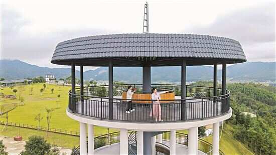 ■在梅州市蕉岭县广福镇豪岭村的桃花源山庄里,沿着一座观光塔拾级而上,大好风光尽收眼底。 |