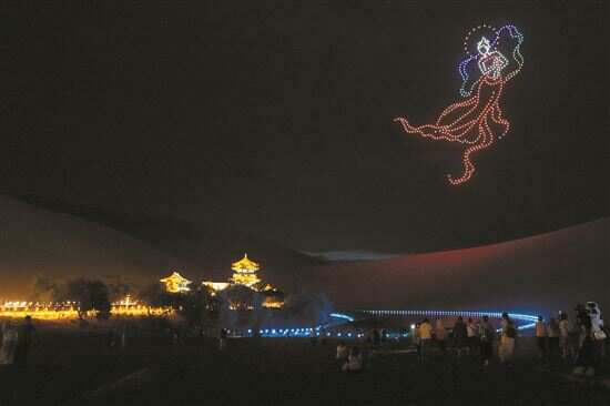 7月15日晚,游客在敦煌鸣沙山月牙泉景区观看无人机灯光秀。