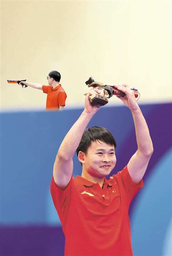 ■巴黎奥运会射击男子10米气手枪决赛中,中国选手谢瑜夺冠。 新华社发