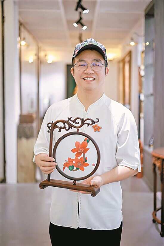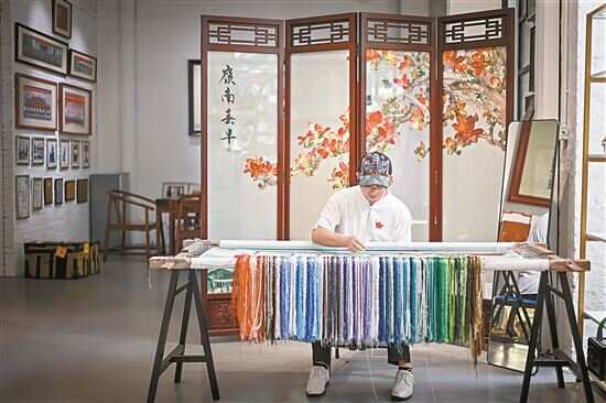 ●开栏语 2024年10月1日,中华人民共和国将迎来第75个生日。为庆祝新中国成立75周年,即日起,新快报推出《“筑梦现代化 共绘新图景”——新中国成立75周年系列策划》。 退役军人是党和国家的宝贵财富,也是经济社会发展的重要参与者、建设者、贡献者。褪下戎装心不改,“第二战场”立新功。为挖掘退役军人不忘从军志、实干显担当的先锋故事,新快报推出《“戎”耀新时代》栏目,展现退役军人投身中国式现代化建设的奋斗之姿。 广绣以构图饱满、形象传神、色泽富丽、针法多样、善于变化的艺术特色而闻名,2006年被列为第一批国家级非物质文化遗产名录。在广州荔湾珠江岸边的信义会馆,藏着一个展示广绣瑰宝的地方——广绣·王新元大师工作室。留心观看,在工作室门口,挂着一块荔湾区退役军人就业创业示范点的牌子。 王新元是国家级非遗广绣的市级代表性传承人、广东省工艺美术大师,也是广州市2022年度最美退役军人。戎装在身,他以保家卫国为职责;卸甲归来,他精心耕耘在广绣的一针一线之中,以非遗继承和传播为使命,为广绣的新生探索新的道路,生动诠释了广大退役军人“退役不退志、退伍不褪色”的本色。 西行从军 成为军营男子汉 王新元出生在江西省九江市武宁县,从小与针线结下了不解之缘。“姐姐在县城开了一家服装店,招收了很多学徒。我八九岁的时候,每逢寒暑假会去姐姐店里帮忙,最初做些缝裤脚边、钉扣子、熨烫等基础的针线活。”慢慢熟练之后,王新元10岁时已学会一整套制衣工艺。到了13岁时,受好奇心的驱使,他跟着表姑学起刺绣,并喜欢上了刺绣。 然而,男儿郎绣花,让他遭受了周遭异样的眼光。面对偏见,王新元感到委屈和不服气,高中毕业后选择参军入伍,“为了证明自己是个男子汉”。就这样,王新元踏上了离家的站台,列车一路西行,经过六天五夜的漫长旅途,窗外的景色逐渐从连绵起伏的青山过渡到辽阔的平原,最后化作了白茫茫的一片,他的军旅生活在祖国的大西北——新疆开启。 “进入部队,戎装在身的那一瞬间,我突然感觉自己长大了。我要成长为一名合格的战士,挑起保家卫国的重任。”在新兵团的三个月,王新元经受住了每天高强度训练的考验,很快地褪去了身上的稚气与脸上的青涩,塑造出了坚强的意志品质。凭借优异的表现,新兵第一年,他就被评为优秀新兵;第二年,他成功加入中国共产党。 如今再回忆起军营生活,令王新元印象最深刻的一次是冬天在新兵连的野外拉练。“凌晨1点,我们在睡梦中被紧急集合的号令惊醒。”新兵们迅速穿衣、打好背包,踩着过膝深的积雪一直跑,直到凌晨5点拉练了近4个小时后,新兵们终于看到了驻地的营房。“太累了!当时我们心里都松了口气,以为很快就能休息了。”王新元说,没想到,就在这时新指令响起:“卧倒!匍匐前进,目标营房!”回到宿舍时,他和战友手脚都冻麻了,脱下的衣服冻得都能立起来。 “新兵连是最苦的,但是它最能锻炼人,最能培养一个人的韧性与意志力。我发自内心地想当好一名兵,做任何事情都很拼,永远第一个向前冲。”军旅生涯让王新元锻造出吃苦耐劳、不畏艰险、严于律己的精神品质。这些优秀的品质,随着时间的沉淀和历练,慢慢地刻入生命之中,让他在今后的生活和工作中获益匪浅。 潜心学艺 绣出“针”功夫 退伍后,2001年王新元揣着200块钱南下广州闯荡,求职期间多次碰壁,“当时心里有闪过干脆回家的念头,但我不甘心,想着继续坚持一下,只要找到工作就能留下来”。后来,王新元从月薪400元的保安做起,很快成长为公司的保安队长、保安主管。一次机缘巧合之下,他在陈家祠看到粤绣名家吴玉珍的广绣作品,“儿时心底的刺绣梦像一颗种子,在这一刻被唤醒了”,王新元当即向粤绣名家梁国兴和吴玉珍夫妇表达了自己对粤绣的喜爱,并要到了联系方式,留作日后拜访。 第一次踏入梁国兴、吴玉珍夫妇家的情景,王新元记忆犹新。“大师家在佛山顺德,我从广州坐客车再打摩的,花了7个多小时才到他们家。推开门一看,家里坐着的全是女绣娘,她们差不多50来岁,而我当时是个20多岁、瘦巴巴的小伙,心里一下子紧张起来,怦怦跳个不停。” 王新元如同一名闯入者,闯入广绣的大门。这次见面之后,王新元决定拜师梁国兴、吴玉珍夫妇,进行系统的学习。一边打工,一边学艺,一周多次坐7个多小时的车往返广州与顺德,风雨无阻,这是王新元三年学艺的常态。尽管辛苦,但他咬牙坚持了下来,刺绣技术日渐提高,渐入佳境。 由于长期半工半学,加之对刺绣的痴迷,经常一绣就是十多个小时,王新元积劳成疾。最终,他决定辞去工作,将传承与发展广绣作为其一生的事业。二十余载弹指一挥间,曾半工半读的小学徒,如今已成长为省级工艺美术大师、国家级非遗代表性项目传承人。 孜孜不倦 非遗传承不止步 作为年轻一代的广绣传承人,王新元一直致力于广绣的传承与创新。他身体力行,积极拓展广绣新的审美路径,创作专属于自己的刺绣题材。“广绣的传统创作题材是花鸟、木棉、荔枝,广绣要传承发展,就要跳脱出传统题材的局限。”于是,王新元开拓性地以青铜器名画、人物肖像等为主题“入绣”,让广绣进入更为广阔的艺术表达空间,让更多的人认识、欣赏广绣。 王新元还大胆走“艺术+”路径,与游戏、汽车、文创等领域开展跨界合作。他