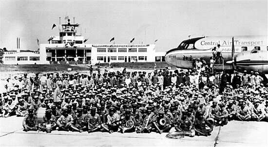 ■1950年“八一开航”,民航职工、机组人员和乐队队员在旧航站楼及飞机前合影 |