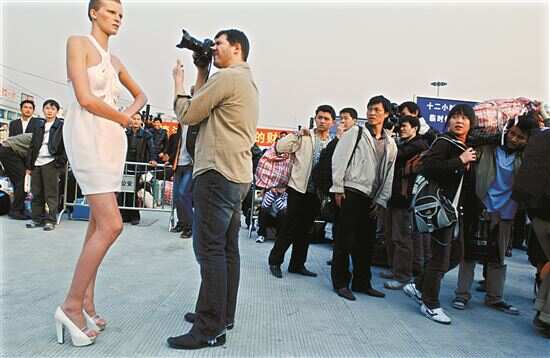 21世纪 2007年春运期间,广州火车站,一位外国男摄影师手持相机,为着装艳丽、表情冷酷的外国女模特拍时装照片。邓勃/摄 |