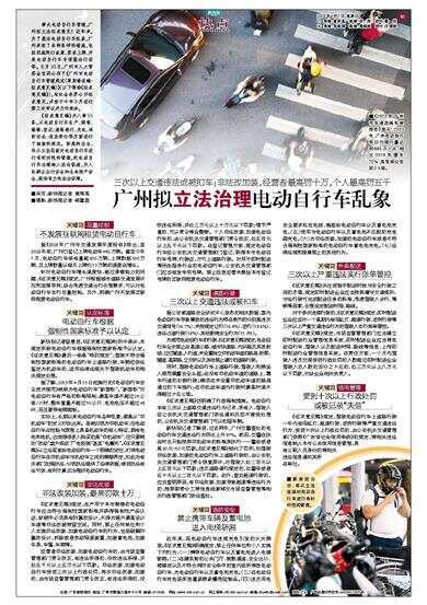 三次以上交通违法或被扣车;非法改加装,经营者最高罚十万,个人最高罚五千 事关电动自行车管理,广州拟立法征求意见!近年来,为了整治电动自行车乱象,广州采取了各种各样的措施,包括实施限行政策、要求上牌、开展电动自行车专项整治行动等。8月30日,广州市人大常委会官网公布了《广州市电动自行车管理规定(草案修改稿·征求意见稿)》(以下简称《征求意见稿》),向社会各界公开征求意见,并拟于今年9月进行第三次审议并交付表决。 《征求意见稿》共八章55条,从电动自行车生产、销售、维修、登记、道路通行、充电、消防安全、违法责任等方面进行了细致的规定。新规的出台,将从立法层面对电动自行车进行有针对性的管理,把电动自行车治理纳入法治轨道,为人民群众出行安全和生命财产安全,提供有力的法治保障。 关键词 总量控制 不发展互联网租赁电动自行车 据《2023年广州市交通发展年度报告》指出,至2023年底,广州已登记上牌电动车442万辆。截至今年7月,电动自行车保有量超600万辆,上牌数超500万辆,且上牌数量以每月上牌约10万辆的速度在增长。 针对电动自行车增长速度快、超过承载能力的问题,《征求意见稿》规定,广州根据城市道路交通发展状况和发展导向,综合考虑交通出行合理需求,可以对电动自行车实行总量控制。另外,明确广州不发展互联网租赁电动自行车。 关键词 认定标准 电动自行车根据 强制性国家标准予以认定 新快报记者留意到,《征求意见稿》附则中表示,本规定所称电动自行车根据强制性国家标准予以认定。《征求意见稿》最后一条是“特别规定”:驾驶不符合强制性国家标准的电动自行车上道路行驶,车辆经依法鉴定为机动车的,适用法律法规关于驾驶机动车的相关规定处理。 据了解,2019年4月15日起施行的《电动自行车安全技术规范》被称为电动自行车“新国标”。“新国标”对电动自行车有严格的标准限制:最高车速不超过25公里/小时、整车重量不超过55公斤、电池电压不超过48伏,而且要带有脚踏板。 实际上,长期以来电动自行车各种乱象,都是从“非机动车”的定义衍生出来。虽被归类为非机动车,但电动自行车在性能与原理上具备机动车的核心特征,拥有电池和电机,这使得很多人购买的是“非机动车”,但只要稍加“改动”就升级成了“电轻骑”甚至“电摩托”。《征求意见稿》从立法层面给电动自行车一个明确的定位,打消电动自行车在非机动车与机动车之间的模糊界定,如此为有关部门加强执法、分类执法提供了法律依据,做到执法有法可依,有利于真正治理好电动自行车。 关键词 非法改装 非法改装加装,最高罚款十万 《征求意见稿》规定,生产用于本市销售的电动自行车应当符合强制性国家标准并获得强制性产品认证,软硬件必须具有防篡改设计,不得为提升最高设计车速等非法改装预留空间。同时,禁止任何单位和个人实施非法改装、加装电动自行车的行为,包括破解防篡改设计,拆除或者改动限速装置,加装蓄电池,加装伞具、车篷、车厢等。 经营者非法改装、加装电动自行车的,由市场监督管理部门责令改正,有违法所得的,没收违法所得,并处五千元以上五万元以下罚款。非法改装、加装电动自行车受到三次以上行政处罚,再次非法改装、加装的,由市场监督管理部门责令改正,有违法所得的,没收违法所得,并处三万元以上十万元以下罚款;情节严重的,可以责令停业整顿。个人非法改装、加装电动自行车的,由公安机关交通管理部门责令改正,处五百元以上五千元以下罚款。在登记管理方面,规定电动自行车经公安机关交通管理部门登记,取得本市电动自行车号牌、行驶证,方可上道路行驶。对用于即时配送等民生服务行业的电动自行车,公安机关交通管理部门应当核发专用号牌。禁止投放经营未悬挂本市登记号牌的互联网租赁电动自行车。 关键词 道路行驶 三次以上交通违法或被扣车 据公安部道路安全研究中心发布的相关数据,国内电动自行车导致事故的违法行为排在前列的分别是违反交通信号(16.7%)、未按规定让行(16.6%)、逆行(13.6%)、违法占道行驶(13%)、其他影响安全行为(11.9%)。 为规范电动自行车的行驶,《征求意见稿》规定,电动自行车全天禁止在高速公路、城市快速路、内环路及其放射线、过江隧道、人行道,未设置独立非机动车道的路肩、桥梁、隧道、高架路、立交桥以及其他禁止通行的道路行驶。 同时,驾驶电动自行车上道路行驶,驾驶人和乘坐人规范佩戴安全头盔;在没有非机动车道的道路上,靠车行道的右侧行驶;确须在未设置非机动车道的路肩通过的下车推行;在非机动车道内行驶时最高时速不得超过十五公里。 《征求意见稿》还明确了行政强制措施。电动自行车有三次以上道路交通违法行为记录,所有人、驾驶人经公安机关交通管理部门依法通知后拒不接受处理的,公安机关交通管理部门可以扣留车辆。 新快报记者了解到,过去两年,广州交警查处的电动自行车交通违法行为同比上升37%。然而,交警在执法时也只能按照非机动车的标准来执行——警告或者是20元~50元罚款。《征求意见稿》细化了罚则,如驾驶非法改装、加装的电动自行车上道路行驶的,由公安机关交通管理部门责令恢复原状,对驾驶人处二百元以上五百元以下罚款;违反道路通行规定的,处警告或