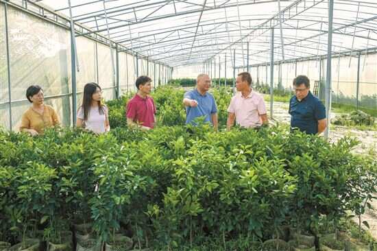 ■青平镇红橙育苗基地科技助农更安全、更大效益地发展红橙种植。图为工作队向基地负责人了解相关情况。 |