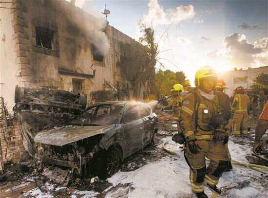 ■9月22日,在以色列北部城镇比亚利克,消防人员在袭击现场进行灭火作业。新华社发 |