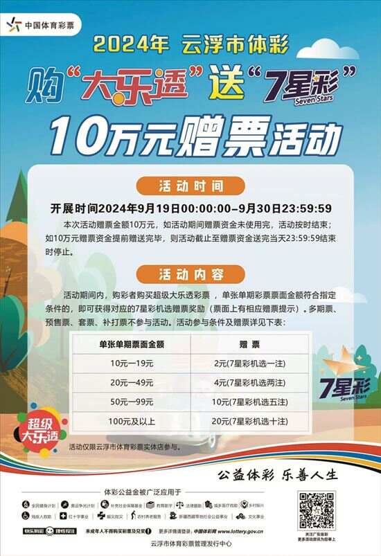 新快报讯 记者陆妍思报道 为回馈广大购彩者对中国体育彩票的支持,云浮体彩和东莞体彩近日接连开展大乐透赠票活动。 云浮:购大乐透送7星彩10万元赠票 为回馈广大购彩者对中国体育彩票的支持,云浮市体彩于9月19日00:00:00起,开展购大乐透送7星彩10万元赠票活动。本次活动参与门槛最低仅需10元。欢迎广大购彩者前往云浮市体彩实体店关注参与。 本次活动时间为:9月19日00:00:00—9月30日23:59:59。(活动期间若10万元赠票资金提前赠送完毕,则活动截止至赠票资金送完当天23:59:59结束停止。) 活动期间内,购彩者凡在云浮市体彩实体店购买大乐透彩票,单张单期彩票票面金额符合指定条件的(详细条件见活动海报),即可获得对应的7星彩机选赠票奖励(票面上有相应赠票提示)。多期票、预售票、套票、补打票不参与本次活动。 东莞:大乐透380万元赠票活动启动 为了感谢广大体彩购彩者对于中国体育彩票的支持,东莞市体育彩票管理中心超级大乐透380万元赠票活动,让广大体彩购彩者在秋高气爽的季节里感受乐趣和福利。 本次赠票活动,自2024年9月21日00:00:00起至2024年10月31日23:59:59结束,活动赠票资金为380万元,若赠票资金提前使用完毕,则活动在资金使用完毕的当日23:59:59结束。如果购买的彩票同时符合东莞活动的条件和广东省体育彩票中心活动的条件,则该张彩票只能参加广东省体育彩票中心的活动。 活动期间,购彩者凡在东莞市体彩实体店购买超级大乐透游戏,单票票面金额达到50元(含)至99元,即可获得1张10元超级大乐透机选5注赠票;单票票面金额达到100元及以上,即可获得1张20元超级大乐透机选10注赠票。多期票、预售票、套票、补打票不参与本次活动。活动仅限在东莞市体育彩票实体店参加。