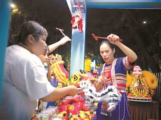 9月29日,广州市花都区赤坭镇“潮涌巴江”文创街区暨国庆黄金周夜经济系列活动在赤坭镇榕树街正式启动。在文创街区,清远市连山壮族瑶族自治县太保镇的摊位设在入口最显眼处,摊位上陈列的大小醒狮狮头吸引了市民游客的目光。 这是赤坭镇通过花都区派驻清远市连山太保镇帮镇扶村工作队(简称“工作队”)邀请当地参加活动,展示特色产品,为消费帮扶出力,助力乡村振兴及“百千万工程”。 ■新快报记者 李应华 文/图 发掘历史底蕴 做强文化产业 新快报记者看到,现场展示的都是来自太保镇重点项目——莲塘狮舞文化产业基地的文创产品。 在连山太保镇,莲塘村狮舞有着深厚的历史文化底蕴,早在1940年村内就有了“莲英剧团”,莲塘戏因而在全县各地流传,深受喜爱。2018年,莲塘村组织牵头成立了连山龙狮运动协会,在全国各地参加表演,还把莲塘狮舞表演带到了海外,获得“岭南狮王”等多项荣誉。 在县人大以及镇党委、政府和工作队的推动下,经赴广州、河源调研考察,当地确立了打造莲塘村狮舞文化产业的探索方向。太保镇党委、政府一方面积极争取上级政策、资金支持,另一方面大力引入社会资本,在工作队的推介下,成功吸引广东醒狮省级代表性传承人、非遗醒狮赵家狮第五代传人赵伟斌和“醒狮扎作技艺”市级非遗代表性传承人陈金明入股。 2022年,连山壮族瑶族自治县竹之星民间工艺专业合作社、清远玖莲文化产业发展有限公司先后成立,推动莲塘狮舞文化产业成功落地。 莲塘狮舞文化产业基地利用原莲塘教学点作为生产场地,设手扎工艺、彩绘、缝纫等车间,采取“乡村振兴车间+公司+合作社+农户”的运营模式,邀请非遗传承人和彩扎技艺人在车间授课,免费对有兴趣从事彩扎、彩绘、缝纫等工作的村民进行岗位培训,确保生手村民一步步成为熟手,实现“家门口”就业增收。 文创产品受欢迎 狮舞文化引关注 成立以来,莲塘狮舞文化产业基地致力于推动民族文化产业的繁荣发展,工作队通过引进先进的生产技术和设备,提升了狮舞产品的质量和工艺水平,提高了市场竞争力。这些创新和努力,为当地村民提供了更多就业机会,推动了农民增收,也为乡村振兴注入了新的活力。工作队介绍,目前项目收到的醒狮狮头订单最高可以达到一年2万头,不过目前年产量仅5000头左右,因此正积极考虑升级制作工艺,提高产量,推动产业发展壮大。 活动现场展示的产品从几元到几十元都有,按比例微缩但细节满满的醒狮狮子头、可通过牵线控制的醒狮整体模型都是惟妙惟肖,吸引了男女老少各类市民游客的关注。两位身穿当地民族服饰的工作人员热情地演示产品的各种玩法,摊位前人气高涨。“以前看到都是用舞狮的大狮头,现在做成文创产品,细节保留得很好,价格也可以接受,太棒了。”市民吴女士高兴地说。 为更好地推介狮舞文化,现场还展示着醒狮狮头的成品和半成品,工作人员介绍狮头扎作的过程,引起了不少市民关注。