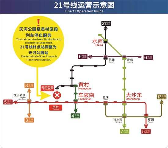 新快报讯 记者李佳文报道 广州地铁再次发布提醒,为实现广州轨道交通首条环线——11号线年底开通的目标,10月2日起21号线天河公园至员村区段将进行拆解施工,当天运营时间起天河公园至员村区段的列车将正式停止服务,21号线终点站将由员村站调整为天河公园站。拆解改造工作预计需要88天。 改造中,员村站和天河公园站的部分区域将进行围蔽施工,其中员村站属于原11号线的区域均需围蔽,包括换乘通道、站厅站台以及A、E、F三个出入口;天河公园站需围蔽1和2站台,同时启用3和4站台作为21号线列车停靠和乘客上下车。 广州地铁表示,针对21号线无法直接换乘五号线的情况,受影响乘客可选择经四号线黄村站到车陂南站换乘五号线,还可通过七号线水西站到大沙东站换乘五号线,这种迂回换乘不会改变现有票价。在工作日早高峰时段,广州地铁将增加四号线车陂站、五号线车陂南站的空车投放,并加强相关换乘车站和重点车站的现场服务和人员引导,强化客流管控,高峰期视情况采取分级限流措施,保障乘客安全有序乘车。