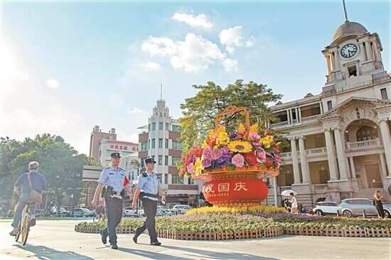 ■国庆假期,广州市公安局荔湾分局岭南派出所民警在粤海关大楼附近开展巡逻。通讯员供图 |