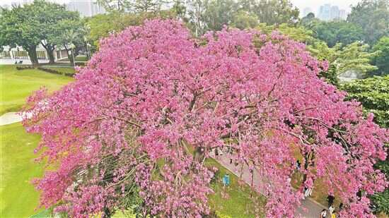 新快报讯 记者夏世焱摄影报道 广州近日天气持续晴好,城区各处异木棉相继盛放。在越秀区麓湖景区聚芳园,一株异木棉花开满树,鲜艳的花朵在周围绿树的衬托下异常醒目,吸引了不少市民前来打卡拍照。