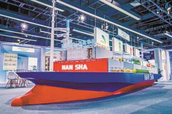 ■南沙在进博会展位上打造一艘装载各类进口产品的集装箱船。 |