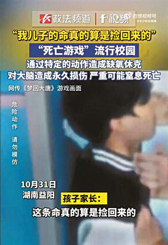 有外地学生参与可致人晕厥甚至丧命的危险游戏,广州市教育局要求全市摸查防范 近日,有媒体报道称湖南益阳的一个孩子在玩“死亡游戏”时险些危及生命。 这一在20年前已被教育部明确禁止的问题,又重新出现在世人眼前,针对这一话题,新快报记者兵分多路,与学校老师、医生、未成年人保护专家对话,共同探讨应对之策。 ■新快报记者 高京 李斯璐 邓善雯 通讯员 刘文琴 韩羽柔 “死亡游戏”究竟是什么? 资料显示,“死亡游戏”又称“心跳游戏”或“闭气窒息游戏”,还被称为“梦回大唐”“死亡三秒”。游戏最早源于东南亚等地,上世纪九十年代末传入我国。 参与这一游戏的核心点在于,让参与者快速达到窒息缺氧的状态。 传言称,人在窒息片刻出现幻觉,可以“看见童年场景”或是“目睹梦幻景象”,甚至重温了“前世记忆”。对于充满好奇心理的未成年人来说,往往会禁不住诱惑,忍不住想去“体验”。 早在2004年底,教育部就对此明确表态,“死亡游戏”极易损害青少年的身心健康,坚决制止此类游戏在学生中传播、蔓延。同时要求中小学校进一步加强管理,保障广大青少年学生健康成长。 2005年,教育部再次发文,要求国内所有网站删除有关“死亡游戏”的介绍。不过在这么多年后,这一危险游戏再次出现了。 在接受媒体电话采访时,湖南益阳参与“死亡游戏”的孩子家长表示:“我儿子这一次这条命真的算是捡回来的,被他同学压住心口以后很快就晕倒了,在晕倒之前,他也发出那种很恐怖很大声的尖叫。直到第二天早上,我儿子还是感觉头痛。” 医生说 能否“回大唐”不知道,但窒息感不宜“上头” 眩晕感、窒息感、胸口受压感、幻觉……游戏者描述的这些“回大唐”的感觉,在医学专家眼中,并不能与游戏的愉快感画等号。相反,是生命受威胁的信号。 心血管内科医生张培东既是南方医院心内科副主任,亦是致力医学知识传播的科普达人。他近日也从有关报道了解到“梦回大唐”“窒息游戏”“死亡游戏”的信息,并表示担心:“如果游戏者是准确描述了体验感的话,这些感觉放在心内科临床,是属于‘心脏骤停’的症状。”简单来说,就是通过一系列的动作行为,让大脑供血不足,迷走神经兴奋增强,造成人为的脑缺血晕厥感觉。 他表示,学生追求这种奇怪感觉,除了猎奇,与成人追求醉酒、醉茶、醉咖啡因等“上头”感觉有关。“当中的危险因素就是‘度’的问题。一旦没有掌握好度,严重可能引发死亡。” 此外,还要考虑游戏者的身体状况是否适合这样玩乐。“有的人也许‘上头’劲儿一过就没事,但医学界做过筛查,100个孩子里,总会有零星的人存在心电图异常。若心脏有基础问题的孩子,这样玩耍‘玩’过头,造成致残,甚至死亡等不可挽回的悲剧,伤害的是一个家庭。” 另一个危险因素,是从急救角度考虑的。中山大学孙逸仙纪念医院急诊科杨正飞主任指出:“突然晕厥的情况下,如果游戏者存在饱食的状态,就容易导致反流误吸,引起喉头水肿风险,进一步加重缺氧感。而倒地的一刻,也有造成颅内损伤的风险。更关键是,孩子若在校园场所发生这些游戏意外伤害,导致昏迷不醒,就要进行非常专业、标准的急救措施。比如摆平躯体、监测生命体征、紧急心电图等,若昏迷原因涉及摔到头,还要马上拍CT,查找是否存在颅内伤……这些紧急救治的举措,是一定要及时送院、得到专业处理的。” 实际上,“梦回大唐”再次在校园出现的消息经过网端传播之后,除了引起医生关注并表示担心之外,广东省卫健委也已通过官方公众号“健康广东”发表健康科普文:《回不回大唐不知道,回西天机会比较大》,以作紧急提醒。 新快报记者走访多家医院急诊科、心血管内科等专科,科室主要负责人表示,近年尚未遇到过因“死亡游戏”“憋气游戏”而送院救治的患者。但是,专家提醒,这种游戏的玩法并不健康,应该杜绝。 官方说 广州市教育局:多次发布提醒防范 由于“死亡游戏”极易损害青少年的身心健康,广州市教育局多次发布通知,要求各区各校要摸查防范,提醒家长加强监督、提高警惕。 据悉,广州市教育局已于11月2日针对该类问题发布工作提醒:近期,一种名为《梦回大唐》的危险类游戏流行于学生之间,游戏的玩法很简单……,此游戏会导致体验者瞬间晕厥甚至危及生命。一是各区各校要高度重视,加强安全教育,提高学生辨知危险的能力。二是请各区各校立即开展摸查,一旦发现要批评教育、严肃处理。三是加强家校联动,提醒家长加强监督、提高警惕,及时关注孩子的行为动向,发现有此类现象时应立即制止并宣讲其危害。 11月4日,广州市教育局再次发出通知,要求各区各校加强针对此类“游戏”的摸查防范,报送排查情况。目前暂未发现广州市校园存在此类情况。 老师说 开展“文明游戏”班会课 “目前我们学校从多条线收到了关于这项游戏的提醒通知,包括教育局、媒体、公众号等等,目前我校还未出现危险游戏的苗头。”广州大学附属小学德育副主任、心理老师冯妙然表示,老师们对于此类消息非常敏锐,在教育局发布通知之前校内行政部门和德育部门就做了相关提醒。 冯妙然提到,学校一方面防微杜渐,德育部门组织各年级班主任制作了相关班会课主题,在全校开展了“课间文明游戏”的系列宣导活动,另一方面学校有教师值日制度,课