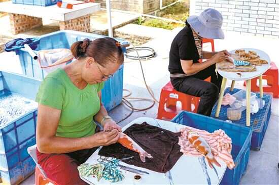 ■石罗村锦鲤生产养殖示范基地的工人正为锦鲤“做美容手术”。 |