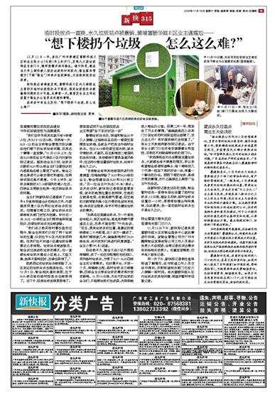 临时投放点一直换,永久垃圾站点被撤销,黄埔富颐华庭R区业主遇尴尬—— 11月11日一早,家住广州市黄埔区富颐华庭R区的业主张女士(化姓)早上打开门,发现几大袋垃圾堆在自家门口,随即报警并询