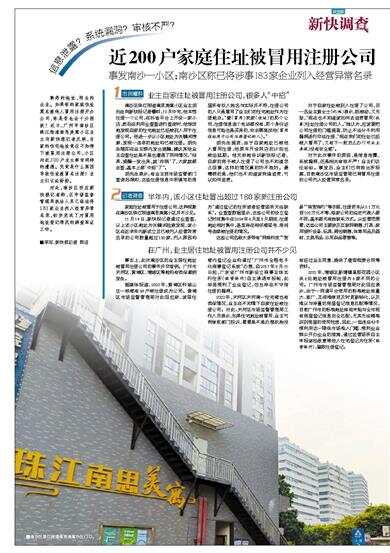 信息泄露?系统漏洞?审核不严? 事发南沙一小区;南沙区称已将涉事183家企业列入经营异常名录 熟悉的地址,陌生的企业。如果你的家庭住址莫名被他人冒用注册开办公司,你是否也会十分困扰?