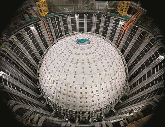 新快报讯 11月20日,随着最后一块光电倍增管模块安装完成,广东江门中微子实验探测器主体建成。 江门中微子实验大科学装置,是科研团队耗时多年,在广东江门地下700米深处建造的一个巨型实验室。 在实验大厅里,挖有一个44米深的水池,江门中微子实验探测器就在其中,它由直径41米的不锈钢网壳、直径35.4米的有机玻璃球、45000只光电倍增管等关键部件组成。 江门中微子实验以测量三种中微子质量顺序为首要科学目标。 中微子是构成物质世界的基本粒子之一,因为极难探测,也被称为“幽灵粒子”,至今仍有许多未解之谜。未来,科研人员通过江门中微子实验探测器捕捉中微子并对其展开研究,可以更好理解宇宙和物质世界。