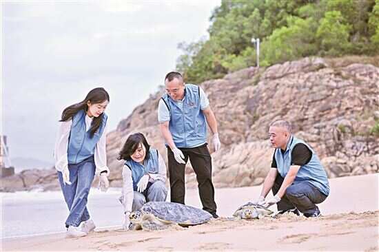 ■广州市林业生物防治检疫和渔业保护区管理中心将收容救护的两只绿海龟放归大海。 |