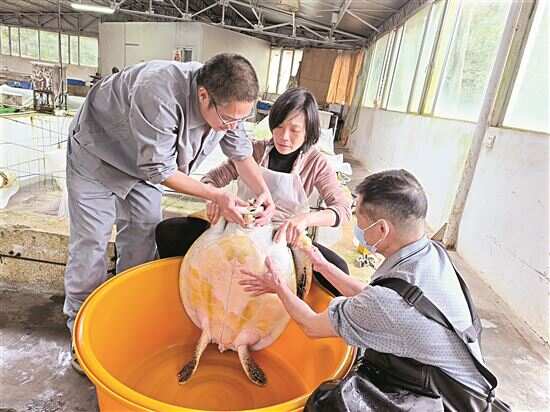 11月14日,两只绿海龟“五一”和“小九”再次爬上了暌违已久的海边沙滩。金黄的沙滩踩起来分外柔软,蔚蓝的大海上海风徐徐。在愣了片刻后,它们终于迈开脚步,兴奋又陌生、胆怯又坚定地向大海爬去,留下四道长长的脚印…… “五一、小九,回家吧!”看着这一幕,广州市林业生物防治检疫和渔业保护区管理中心(广州市水生野生动物救护中心)(简称“中心”)的救护人员黄维燕瞬间红了眼眶。今年11月正值广东省暨广州市第三十四届保护野生动物宣传月,该中心在惠东海龟国家级自然保护区开展“自然护理·广州”水生野生动物放归活动,将收容救护的两只绿海龟放归大海。 ■采写:新快报记者 王彤 通讯员 林园轩 ■图片:受访者供图 五一的故事 误食塑料和金属,精心照料三个月 2022年5月1日,中心接收了南沙区农业农村局移交的一只绿海龟,救护人员给它取名“五一”。当时,五一背甲颜色异常,右前肢有伤,划水不畅,不愿游动,而且拒绝进食,情况很不乐观。 为查找病因,救护人员立即将它送往专业机构进行全面检查。经抽血化验、CT检查后,发现主要病因是五一误食多块塑料和金属垃圾。“这些垃圾淤积于它的消化系统内,造成消化功能弱化、营养不良、严重缺钙。”救护主管陈敏瑶说。经团队研究会诊,他们得出治疗意见:灌喂药物,尽快排出异物,同步补充营养,促进身体康复。 从此,每天,救护人员把乳果糖、艾莫瑞等药物按量混合好,注入灌胃针,把五一从池子抱出来,开始灌喂药物。整个过程需要3名救护人员:一人负责竖抱,稳住海龟身体;一人负责掰开嘴巴;还有一人负责插灌胃管和灌药。灌药结束后还要继续竖抱着五一静置10分钟,防止药液回流。 “在接受治疗的日子里,感觉五一似乎通了人性,从一开始抗拒挣扎,到逐渐配合治疗。就连后来去体检机构复查,路上也安静了许多。它可能知道我们是朋友吧。”黄维燕回忆道。 除了喂药,救护人员陆舒茵和同事们还需天天去打捞五一的粪便,认真清洗观察,以便找出误食的异物。终于,皇天不负苦心人,五一吃进去的塑料和铁丝,陆陆续续出现在粪便里。“味道肯定不好。但每一次的异物排出都给我们带来极大信心和鼓舞。”陆舒茵说。 经过三个月治疗和照料,五一再次复查CT,体内异物消失了!它也终于开始主动进食了。救护人员精心为它设计食谱,寻找含钙量高的蔬菜,将钙片塞进虾壳里进行投喂。为了让食物更接近天然,救护人员还会特意从遥远的海产品养殖场购入海藻作为补充。 就这样,五一食欲一天比一天好,体重也增加了不少。两年来,体重从23.7kg增加到33.8kg,体长×体宽从56cm×55cm增加到65cm×62cm,身体各项指标均恢复正常。 小九的故事 误入拖网背甲破裂,年轻力壮恢复快 2023年9月20日,一位市民给基地送来一只伤痕累累的小绿海龟。因是九月送来的,所以得名“小九”。据移交它的市民介绍,小九误入渔船拖网,被生硬拖拽上岸,导致身体多处受伤。经检查,小九背甲有两处裂痕,皮肤有多处损伤,胸甲部位出现感染症状,游动起来慢慢悠悠的。 针对这些病症,救护人员定期为其涂抹消炎杀菌药物,经过一段时间的悉心照顾,年轻力壮的小九很快便康复了,游得最欢快,成了救护池里“全场最靓的仔”。 “每次我们到池边喂食的时候,它扑腾几下就冲了过来,昂头待‘饭’,喂啥吃啥,一点都不挑食。”黄维燕说。 放归前,小九的体重由12.1kg增重至18.85kg,体长×体宽由48cm×41cm增长至56cm×47cm。 放归的故事 艰难的抉择:“就像女儿出嫁一样,半喜半忧” 单纯地圈养野生动物,对物种保护没有太大意义。只有让野生动物回归大自然,让它们在自然界生存繁衍,才有利于维护整个生态系统平衡。在五一和小九通过体检、野化训练等多项评估后,救护人员决定将它们放归到广东惠东海龟国家级自然保护区,那里是中国大陆18000公里海岸线上海龟的最后一张产床,也是中国唯一的国家海龟自然保护区。 将五一和小九送归大海,是一个颇为艰难的抉择。朝夕相处之下,大家都十分不舍。 救护人员李建忠每天下班前总要到海龟池旁“打卡”,确认它们一切正常才安心离开。陆舒茵说,五一、小九是女孩子,是爱漂亮的,就经常给它们清理背藻,洗得干干净净的。 “海龟放归大海,在我们看来就像女儿出嫁一样,一半是担忧不舍,因为它们要面临自然界的竞争、面对生存环境的再次考验;一半又是衷心祝福,因为大海才是它们的家,一个真正自由的地方。”临行前,救护主管陈敏瑶在它们耳边叮咛:“在野外不要乱吃东西,特别是塑料袋,不要随便去追捕鱼网里的鱼,不要把遇到的生物都当成朋友……” 数据 绿海龟已人工繁育幼龟1万多只 目前,全世界现存海龟种类7种,在我国海域分布的有5种,分别是绿海龟、红海龟(蠵龟)、玳瑁、太平洋丽龟和棱皮龟。海龟是我国水生野生动物保护的旗舰物种,具有重要的生态、科研和社会价值,皆为国家一级保护动物。 绿海龟并不是绿色的。它的腹甲为白色或黄白色,背甲则从赤棕含有亮丽的大花斑到墨色不等。因体内脂富含主要食物,即海草中的叶绿素而得名绿海龟。和其它海龟一样,除了上岸产卵外,终其一生都在大洋中度过。2024年3月3日,中国珍稀濒危物种数量实现稳中有升,绿海龟已人工繁育幼龟1万多只。 据悉,广州市林业生物防治检疫和渔业保护区管理中心(广州市水生野生动物救护中心)