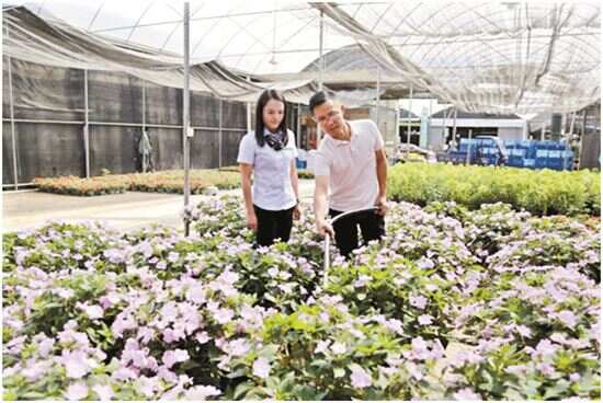 邮储银行客户经理与孙老板在花丛中劳作。 |