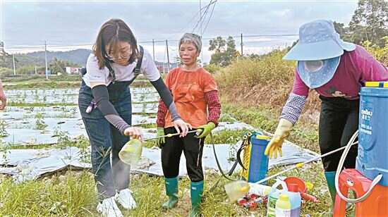 ■陈钰桃(左一)正在为农户提供预防作物虫害的技术指导。 |