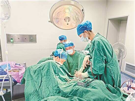 ■梁海锋(中)带领妇产科医护团队为患者施行手术。 |