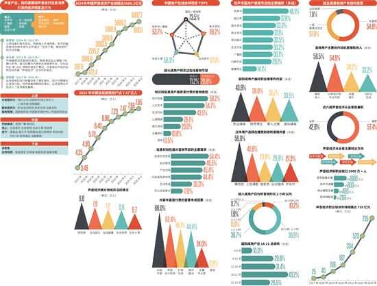 02 时间越碎片化 声音内容越值钱 手机以外智能音箱和车载终端也是主要渠道 声音经济的产业链,上游环节主要为内容创作与内容输出,如音乐、配音、词稿等;中游环节主要为通过各类传播渠道如短视频、在线音频、相声舞台、演唱会等将内容传递给下游环节的各类消费者。 上游的内容生产以传统UCG、PGC模式为主。UGC模式主要由普通用户自行创作,内容互动性强,收入以平台激励收入为主,通过观看量和直播时长计算。PGC模式的内容创作者多为专业内容生产团队,平台与这类优质内容生产团队进行合作,并通过二次创作的方式呈现给用户,因此内容专业性较强,极大丰富平台优质内容版权资源;相应收入以平台签约合作分成为主,通常为买断独家转播。PUGC模式通过UGC模式孵化,以专业用户为内容起点,收入也以平台激励收入为主,通过观看量和观看时长计量收益。 中游的在线音频平台具有内容特性上的不可替代性,与长短视频错位竞争。在线音频平台主要负责内容传播,包括有声书、音频直播、音频社交、博客等形式与内容,根据形式与内容的不同,可进一步划分为综合性音频平台、垂直型内容平台和音频衍生平台。一方面可以解放眼睛和双手,助力用户开启多线程任务模式;另一方面,情感需求音频带来的陪伴感与真实感,以及个人成长类内容可以满足自我提升的需求,均与市场上的视频平台错位竞争。 下游的消费者通过智能手机、智能穿戴、车载系统等多样化渠道连接,延伸至通勤、亲子等应用场景。 随着快节奏生活中用户对碎片化时间的利用,在线音频的经济价值也越来越凸显,有效地在长短视频之外扩充了人们的内容消费场景,具有更强的场景渗透性,适用于更多的应用场景,如通勤、助眠、亲子陪伴等。 除智能手机外,智能音箱和车载终端是用户最常使用的收听渠道,分别占比49.2%和33.8%。其他渠道还有智能家居、智能穿戴设备等。随着在线音频行业在不同智能硬件终端中的布局,音频逐渐渗透生活各个场景。 数据显示,中国在线音频市场的收入预计于2026年增长至1204亿元,其间复合年增长率为42.3%。从消费端口看,在线音频订阅的收入预计2021年至2026年按49.6%的复合年增长率进一步增长。 03 有声书脱口秀和娱乐资讯最受欢迎 UGC创作者已超1300万人 声音经济的消费者中,女性消费者占比达55.4%,男性消费者占比为44.6%。22.3%的消费者分布于一线城市,21.5%的消费者分布于新一线城市,22.0%的消费者分布于二线城市。40岁以下的消费者占比达83.3%,其中,31-40岁占比45.9%。收入为5000-15000元的消费者占比达67.8%,其中,收入在5000-10000元占比为36.1%。 七成用户购买过付费在线音频节目,将近六成用户愿意为知识技能型音频付费,并且选择音频类知识付费产品时优先考虑内容丰富度,其次是界面设计舒适度和合适的价格。有声书、脱口秀以及娱乐资讯是用户主要偏好的节目类型。43.9%的音频用户偏好职业播客的内容,而素人主播也成为音频用户偏好的主播类型之一。 数据显示,56.0%的用户选择在睡觉前收听音频内容;其次,乘坐公共交通时收听音频内容的用户占比为40.6%。超过八成用户收听音频内容时长在2小时以内,43.2%的用户主要在18-21时收听音频内容。 从创作者数量看,中国在线音频行业UGC创作者数量也呈现上升趋势,目前已超1300万人,在线音频平台应加大对UGC创作者的扶持,通过简化音频制作流程、发布一系列音频制作指导、设立音频创作比赛等方式激发用户创作热情,创作高质量的音频内容。 在线音频平台UGC用户持续增加,大多数用户创作内容的核心为个人欲望的表达,用以吸引志同道合的朋友,进而满足自身的社交需求。数据显示,超过七成用户77.5%愿意通过在线音频认识有相同爱好的朋友。 04 人才缺口2000万+ 逾一半从业者是兼职 声音经济行业市场前景广阔,也为年轻人提供了更多的职业选择和就业机会,人才需求的缺口正在拉大,据统计整个新兴声音行业中人才缺口人才都达到2000万+,其中最大的是音频直播,人才缺口约1000万,其次是有声书演播,人才缺口约800万。 数据显示,当前超一半的声音从业者处于兼职的工作状态。随着互联网的飞速发展,声音经济的高速发展,催生各类新兴声音行业业态,从业方向丰富多样。其中,有声书配音、短视频配音的从业人数不断增长,越来越多声音从业者选择网络音频配音、游戏主播、音频主播、互联网营销师等就业方向。 随着声音经济应用领域的拓宽,创作者看到了更多的发展机会,纷纷加入创作团队,以提升个人收入。声音行业划分为线上和线下市场,涵盖有声书、广播剧、在线音乐、在线K歌、脱口秀、音乐节/演唱会、相声以及传统乐剧等领域,催生各类新兴声音职业,包括有声书配音、互联网营销师、直播营销者等。 随着声音产业的细分业态变多,多样化的声音职业为不同爱好和从业需求的求职者提供了丰富的选择。其中,网络音频的就业范围较为广泛,涵盖有声书、自媒体配音、AI、音频直播、短视频和播客等领域,求职者对网络音频领域的职业需求也不断扩大。 声音职业的薪资水平也是吸引人才从业的一大原因。大部分声音职业按照时薪或者分成的形式计算收入,单价一般在100-800元/小时不等,专业及资深从业者的综合月收入基本能达到5000元以上。 从细分领域分析,音频直播的薪酬上限最高,而游戏动漫配音、广