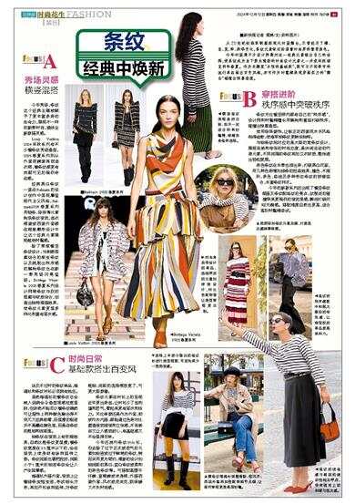 ■新快报记者 梁彧/文(资料图片) 从20世纪初海军制服到现代时装舞台,尽管经历了横、竖、宽、窄、斜等变化,条纹元素依旧扮演着时尚界的重要角色。 今年时装周不少设计师都对这一经典元素
