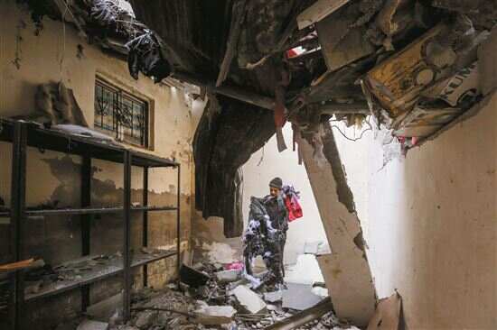 ■在加沙地带中部努赛赖特难民营,一名男子从以军袭击后的房屋废墟中收集物品。新华社发 |