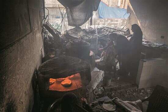 ■12月15日,在加沙地带中部城市代尔拜拉赫,巴勒斯坦人在被毁坏的房屋中烤制大饼。新华社发 |