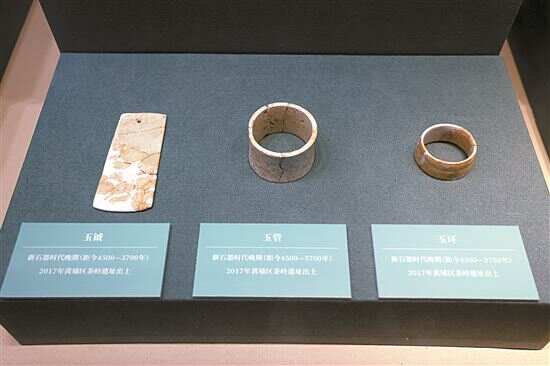 ■玉钺、玉管、玉环,新石器时代晚期(距今4500-3700年),2017年黄埔区茶岭遗址出土。 |