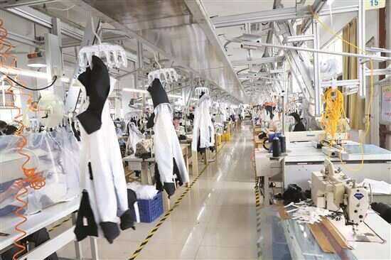 ■尚飞制衣工厂的流水线正在对冲锋衣外壳缝线。洪山/摄 |