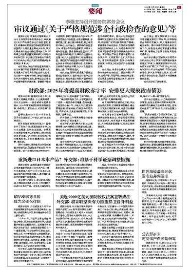 据新华社电 国务院总理李强12月23日主持召开国务院常务会议,审议通过《关于严格规范涉企行政检查的意见》,部署深化药品医疗器械监管改革促进医药产业高质量发展有关举措,研究加强食品安全全链条监管相
