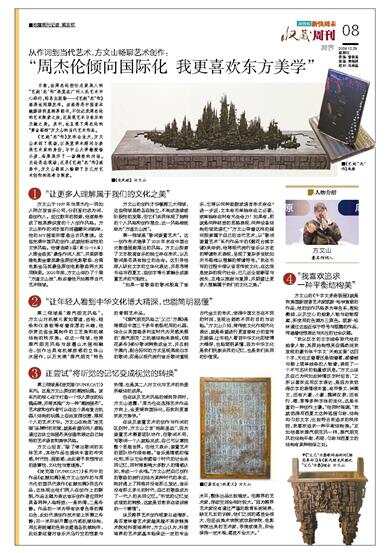 日前,由周杰伦担任总策展人的“艺起‘杰’作”展览在广州人民艺术中心举行,同名出版物——《艺起“杰”作》画册也同期发布。该画册是中国首本融媒体明星跨界图书,不仅记录周杰伦的艺术探索之旅,还展现艺术与音乐的交融之美。其中,也呈现了周杰伦的“黄金搭档”方文山的当代艺术作品。 《艺起“杰”作》发布会当天,方文山来到了现场,以展览学术顾问与参展艺术家的身份,与中山大学教授杨小彦、冯原展开了一场精彩的对话。无论是在现场,还是《艺起“杰”作》画册中,方文山都深入畅聊了自己对艺术创作的思考与探索。 1 “让更多人理解属于我们的文化之美” 方文山于1997年与周杰伦一同加入阿尔发音乐公司,分别签约成为词、曲创作人。经过数年的探索,他逐渐形成了极具辨识度的个人创作风格。方文山所作的词字里行间蕴藏宋词韵味,他的MV画面则营造出古风意境。这些充满中国风的创作,成就他标志性的文学风格。他曾连续8届(第12-19届)入围金曲奖“最佳作词人奖”,并荣获香港电影金像奖最佳原创电影歌曲、台湾电影金马奖最佳原创电影歌曲两大奖项殊荣。2020年底,方文山举办了个展“方道文山流”,标志着他开始跨界当代艺术领域。 方文山的创作才华横跨三大领域,这些领域虽然各自独立,不构成连续或阶段性的发展,但它们共同体现了独特的个人风格和创作理念,这一风格被统称为“方道文山流”。 第一领域是“歌词装置艺术”。这一创作形式继承了2020年末在中国台北敦煌画廊展出的风格。方文山探索了文字脱离音乐的独立存在形式,以及歌词是否具有独立的生命。这引导他深入研究文字的立体化表达,并思考将书法与西夏文、组创字等元素融合成装置艺术的可能性。 “如果一首歌曲的歌词脱离了音乐,它将以何种面貌或语言形式存在?进一步说,文本有无单独存在之必要,或单独存在时有无生命力?如果有,那该是何种材质的思路表现、何种设备结构的视觉语汇?”方文山带着这样的疑问探索属于自己的当代艺术,以“歌词装置艺术”系列作品中的《菊花台减字谱》来举例,他将现代流行音乐以古老的琴谱形式表现,呈现了复杂多变犹如天书般难以理解的琴谱符号。“我在书写的过程中借以省思传统文化,在这信息庞杂的现代社会,已几近全面断层与流失,且难以挽救与复原,并期望让更多人理解属于我们的文化之美。” 2 “让年轻人看到中华文化博大精深,也能简明易懂” 第二领域是“蒸汽朋克风格”。方文山对机械元素如管道、齿轮、链条和仪表板等有着浓厚的兴趣,他欣赏这些金属构件的工艺美和机械结构的秩序美。在这一领域,他将蒸汽朋克风格与泼墨山水画相融合,创作出具有机械质感的立体山水画作,以及充满“蒸汽朋克”特色的青铜艺术品。 “《蒸汽朋克风格之‘父己’方鼎》是将源自中国三千多年前祭祀用的礼器,结合以英国维多利亚时代为灵感来源的‘蒸汽朋克’之机械结构来表现。《烟花易冷》部分歌词转换成金文,并且刻于鼎内,配合拓印的方式呈现黑底白字的歌词,即是以现代流行音乐歌词重现古代金文的形式,使得中国文字在不同的时间,呈现出迥然不同的目的与功能。”方文山介绍,将传统文化作现代化表达,就是希望进行更直接有力的宣传及提倡,让年轻人看到中华文化即使博大精深,也能简明易懂,因为中华文化是我们民族共同的记忆,也是我们共同的价值观。 3 正尝试“将听觉的记忆变成视觉的转换” 第三领域是《庞克猫(PUNKCAT)》系列。这是方文山原创的潮流玩偶。该系列的核心在于打造一个华人原创的玩偶品牌,并将其推广为一种“潮流画布”。艺术家和创作者可以在这个具有复古机器人结构的玩偶上自由发挥创意,展现个人的艺术才华。方文山在构思“庞克猫”品牌时的初衷,就是希望任何人都能通过这块立体画布来创造和表达自己独特的艺术语言和美学风格。 方文山坦言,“除了做出歌词的实体艺术,其他作品也提供丰富的冲突感、时代性、画面感,由此寄予我想传达的故事性、文化性与意境美。” 《庞克猫(PUNKCAT)》系列中的作品《红颜如霜》是方文山创作的与周杰伦的国风代表作《红颜如霜》同名作品,这体现出他们两人在创作上的默契,作品主题为表达音乐创作者应同时具备两种人格特质:一是热情,二是冷静。作品的一半为带有淡青色泽的霜白色,此处代表创作技术面上所需之冷静;另一半则剖开露出内部机械结构,用五彩斑斓的色彩去塑造各机械构件,此处象征着对音乐天马行空的想象与热情,也是其二人对文化与艺术的热爱所凝结的成果。 但在谈及艺术风格的倾向异同时,方文山透露:“周杰伦在选择艺术作品方向上,会更倾向国际化,而我则更喜欢东方美学。” 在谈及装置艺术的创作与作词的区别时,方文山之言“相距甚远”,因为装置艺术需要团队协作,但歌词不用,写歌词一个人就能完成,自己可以掌控整个思维世界。但他又表示,装置艺术的团队协作很有趣。“音乐是情感的催化剂,所以它会形塑每个时代的社会共同记忆,同时将影响大多数人的情感认知,形成一个共鸣。”方文山把自己创作的歌曲的流行归结为某种时代的幸运,刚好遇上了网络并没有那么发达,音乐没有那么多元的时代,自己的歌曲成为了一代人的共同记忆。“听觉的记忆变成视觉的转换,这就是