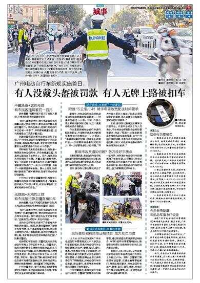 广州电动自行车新规实施首日:有人没戴头盔被罚款 有人无牌上路被扣车